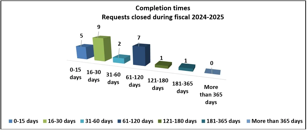 Of these, 25 requests were closed during this reporting period and 9 were carried over within legislated timelines to the next reporting period. An extension was taken on all 9 requests. Lastly, all 3 requests outstanding from the previous fiscal year (2023-2024) were completed beyond legislated timelines and closed in fiscal year 2024-2025.