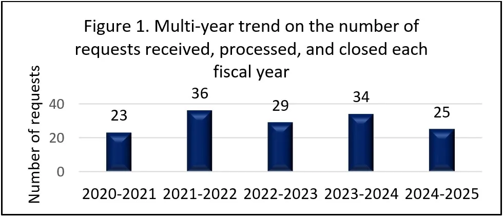 Figure 1 reveals the number of requests received, processed, and closed during each fiscal year over the past five years. We observe that the volume of requests received, processed, and closed was the highest in fiscal year 2021-2022. This was followed by a decline in 2022-2023, an increase in 2023-2024, and a subsequent 27% decrease during the current reporting period compared to the previous year.