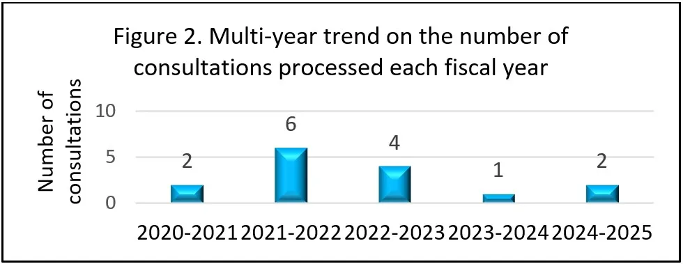 Figure 2 shows the number of consultations processed during each reporting period for the past five years. We observe that the number of consultations processed decreased in 2023-2024 and has remained low, with less than 2 consultations processed over the past two years.