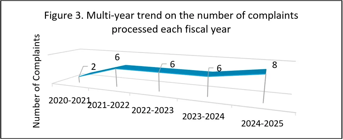 Concerning Figure 3, the graph shows the number of complaints processed during each reporting period over the past five years, including those received in 2024-2025 and carried from previous fiscal years. The Commission received 3 new complaints during the reporting period, and 5 complaints were carried over from previous fiscal years. This is further explained on pages 7 to 8. We can observe that the number of complaints processed in the past three fiscal years has remained consistent at 6, compared to 2 in fiscal year 2020-2021, and 8 in the reporting period.